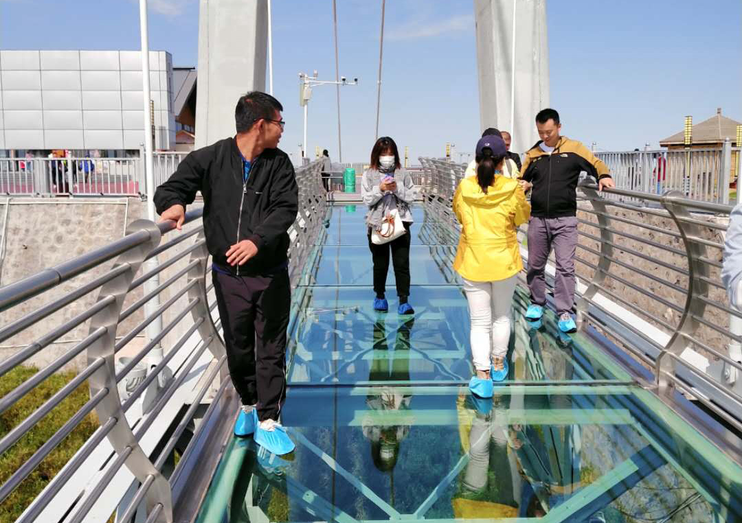 14日下午游覽車載著一行人行駛在山間的小路上,清風(fēng)徐徐,好不愜意,接著迎來了全長639米的玻璃棧道挑戰(zhàn),驚心動魄,姿態(tài)百出。